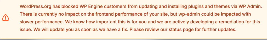 Shortly afterwards, WordPress blocked WP Engine customers from updating or installing plugins and themes on the WP Admin backend, causing tons of sites who were unlucky enough to be caught in the crossfire to suffer performance issues.