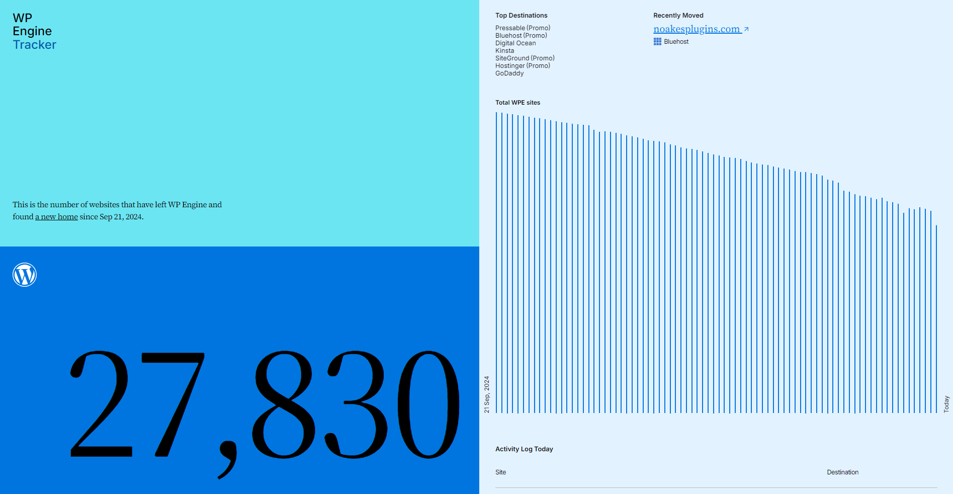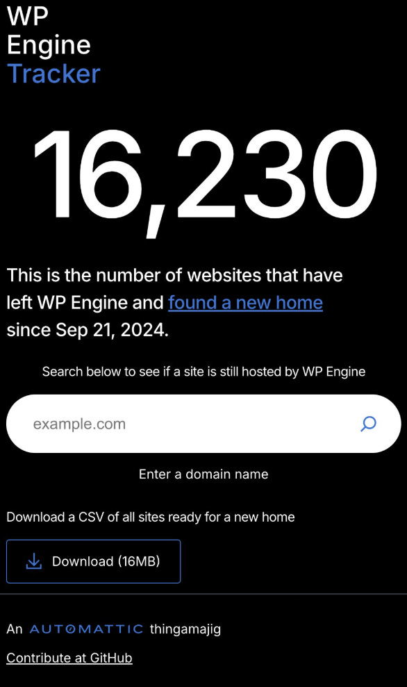 On November 6th, he launched a site called ‘WP Engine Tracker’ (wordpressenginetracker.com) to publicly show how many sites switched away from WP Engine towards other hosting providers.